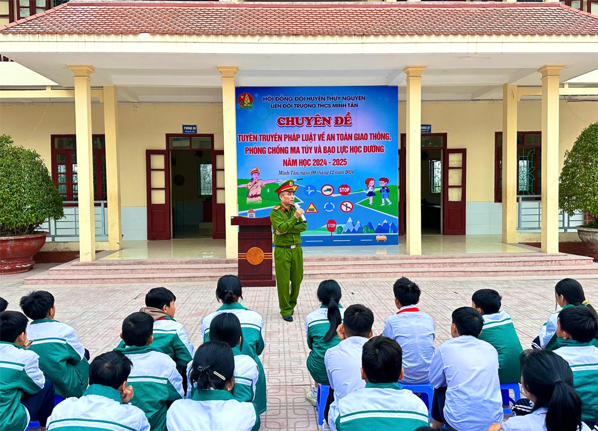 Sáng 09/12/2024, Công an huyện Thủy Nguyên phối hợp Ban Giám hiệu trường THCS Minh Tân tổ chức chuyên đề cấp trường "Tuyên truyền pháp luật về an toàn giao thông, phòng chống ma túy và bạo lực học đường". Dự chuyên đề có Thượng tá Vũ Đình Cường - Phó Trưởng Công an huyện, Đội Cảnh sát giao thông - trật tự (Công an huyện Thủy Nguyên) và hơn 800 học sinh và giáo viên trong trường.
