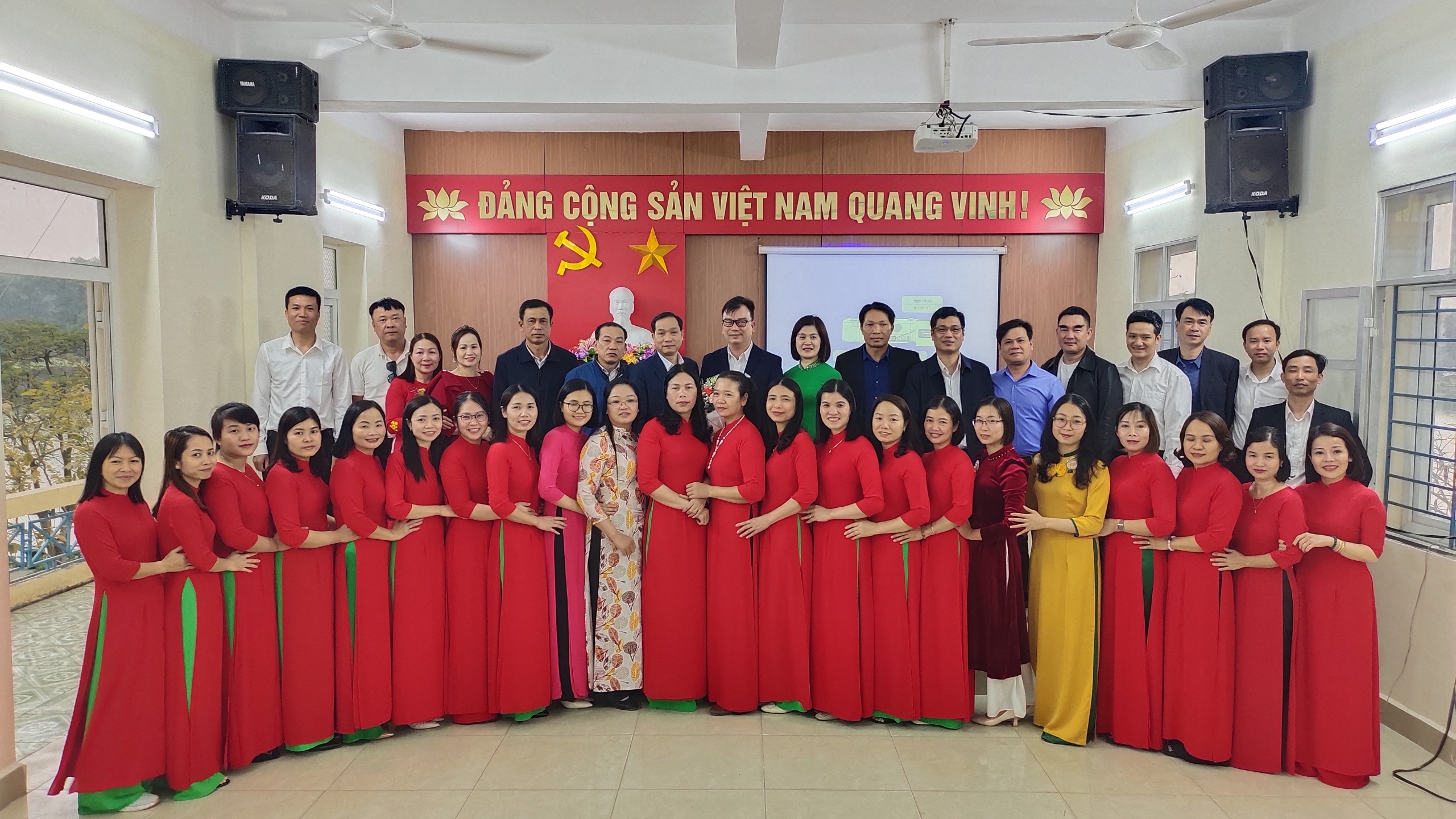 Tập thể nhà trường chụp ảnh lưu niệm cùng đồng chí Nguyễn Thanh Bình